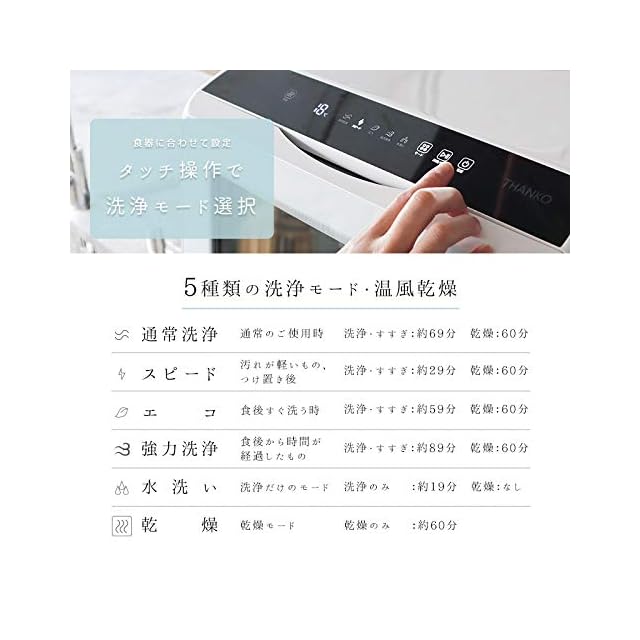 【注意事項】 ※使用中は温度が高くなるので、溶けやすいものなどを周り置かないでください。 ※上面には物を置かないでください。 ※壁に密着させて使わないでください。 ※分岐水栓については最寄りの工務店などにご相談ください。 ※洗剤は食器洗い機専用洗剤をご使用ください(台所用液体洗剤・重曹は使用できません) ※強化ガラス製容器など一部使用できない食器がございます。各食器の洗い方をご確認ください。 ※記載されている物以外は付属しません。 ※常に本体は清潔に使用、保存して下さい。 ※水以外は使用しないでください。 ※落としたり強い衝撃を与えないでください。 ※分解しないでください。 ※本製品をご利用において生じる物品の破損は、補償の対象外となります。 ※小さなお子様の手に届くところで保管、使用しないでください。