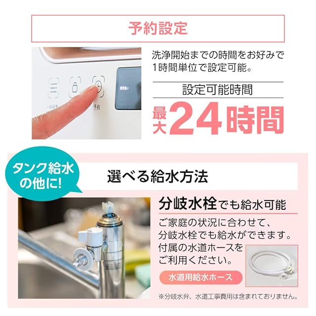 【予約設定・選べる給水方法】コンパクトながらもたっぷり洗えます。食器数約3人分まで(15点+小物類)を一度に入れられます。洗浄開始までの時間をお好みで1時間単位で設定可能です。ご家庭の状況に合わせて、分岐水栓でも給水できます。付属の水道ホースをご利用ください。