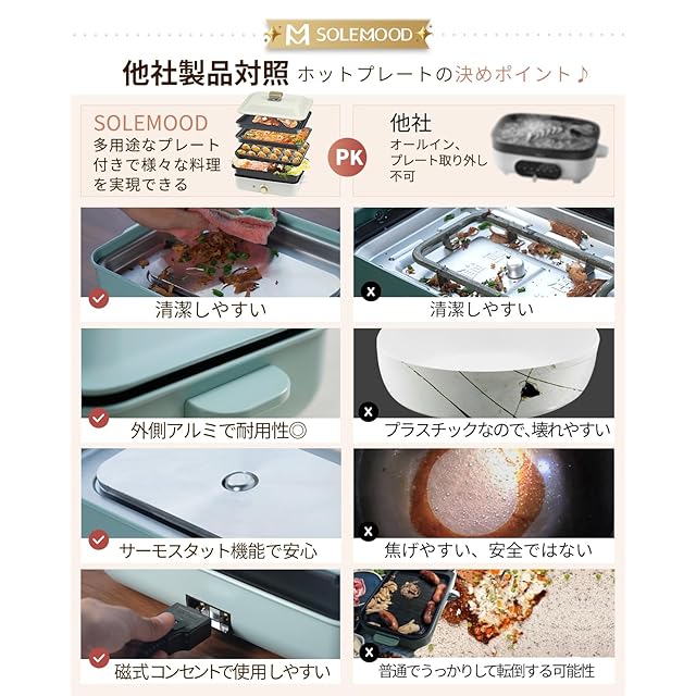 【1台多役・むらなく】三つプレート付き!1200Wのハイパワーホットプレートで、焼肉や焼きそば等の鉄板料理からピザ等のパーティーメニューまでこの1台で楽しめます。テーブルに置いてたこ焼きやしゃぶしゃぶ、焼肉など目の前で調理できるので、家族や友人と一緒に様々なメニューを楽しめることができます。それにむらなく、美味しく焼き上げる!