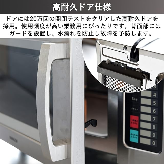 【高耐久ドア仕様】ドアには20万回の開閉テストをクリアした高耐久ドアを採用。一般家庭よりレンジを使う頻度が高い業務用での使用も安心です。背面部にはガードが設置されているので、水濡れを防止し故障を予防します。