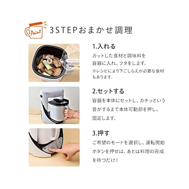 【3STEPおまかせ調理】①カットした食材と調味料を容器に入れ、フタをします。②容器を本体にセットし、カチッという音がするまで本体可動部を押し、固定します。③ご希望のモードを選択し、運転開始ボタンを押せば、あとは料理の完成を待つだけ!簡単3STEPで本格料理が完成します。