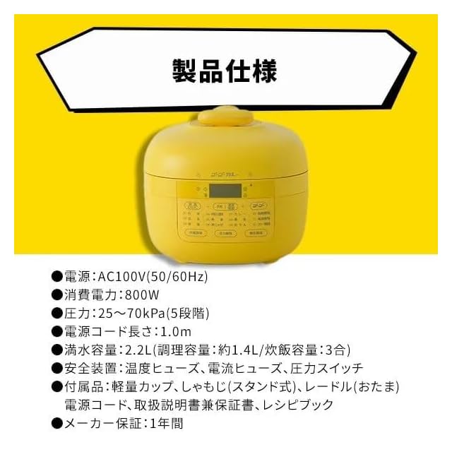 【商品詳細】本体サイズ:幅27×奥行23.6×高さ21.5cm、本体重量:3.6kg、満水容量:2.2L、調理容量:1.4L、炊飯容量(白米):3合、最高圧力:70kPa、電源コードの長さ:1.0m