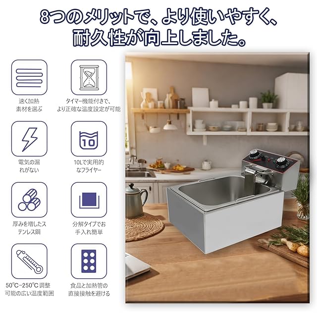 電気フライヤー 家庭用 ステンレス製 10L 大容量 温度調節 タイマー付き 業務用も可 揚げ物 天ぷら 日本語説明書付き