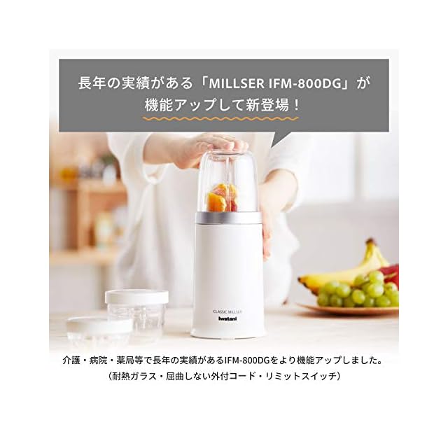 【仕様】[型番]IFM-800DGM[商品サイズ](幅)13.3×(奥行)11.3×(高さ)27.3 mm[商品重量]約 1.5kg(大容器セット時)[カラー]ホワイト[電気仕様]消費電力 200W(50/60Hz)定格 AC100V[定格連続使用時間]連続使用 5 分以内【材質】本体:ABS樹脂、スイッチカバー:AS樹脂、カッターユニット:POM(ポリアセタール樹脂)、プロペラ:ステンレス 304、大・小ガラス容器:耐熱強化ガラス、ミクロン容器:メタクリル樹脂【コードの長さ】1.8m【用途別豊富なレシピを載せたわかりやすい取扱説明書付】