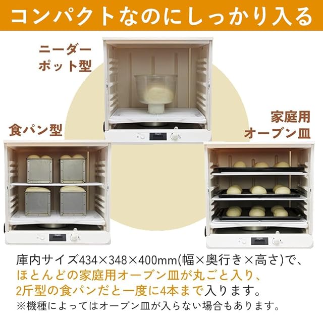 工具なし、1分で組み立てが可能な洗えてたためる発酵器。<br/> <br/>パン生地の発酵はもちろん、色々な発酵に使えます。<br/> <br/>生地の発酵は、パンの出来上がりを大きく左右する大事な工程。<br/> <br/>発酵器は温度と湿度を一定に保ち、パン生地を適正な状態で発酵させることができます。<br/> <br/>天然酵母作りにも使える電子発酵器です。<br/> <br/>庫内サイズ434×348×400mm(幅×奥行き×高さ)で、ほとんどの家庭用オーブン皿が丸ごと入り、2斤型の食パンだと一度に4本まで入ります。<br/> <br/>パネルで簡単に温度(±2℃)・時間の設定ができ、タイマーは24時間まで設定可能。 天然酵母や自家製酵母のパン作りにも便利です。<br/> <br/>※冷却機能はないので、室温以下にはなりません。<br/> <br/>日本ニーダーの発酵器は、自然な庫内対流を起こすために本体下部には、新鮮な空気を取り込むためのわずかな隙間が出来るように設計をしています。<br/> <br/>また付属のコンベクションボードを最下段に取り付けることにより、庫内の温度が <br/>均一になりやすいような工夫をしています。