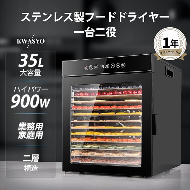 KWASYO フードドライヤー 12段大容量 900W高効率食品乾燥機 二層ステンレス製 ドライフルーツメーカー 30℃ー90℃調節可能 24時間タイマー付き 業務/家庭用 日本語取説/レシピ付き