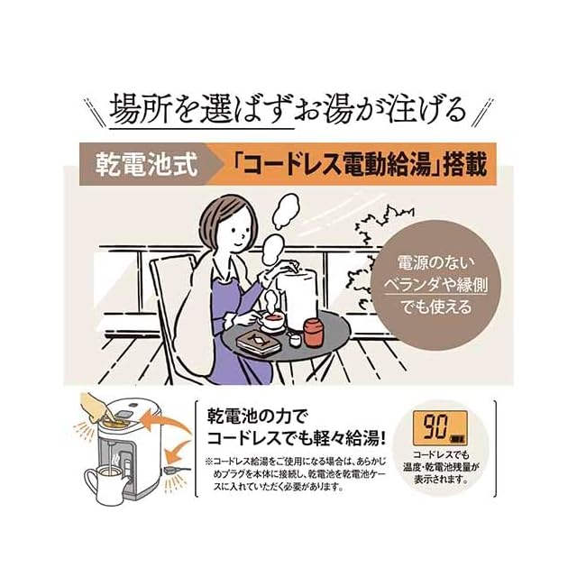 コードレス電動給湯で、プラグをはずしてもお湯が注げる。