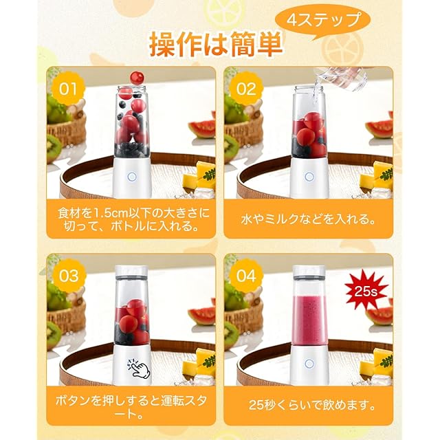【ご注意事項・品質】①ご使用前にジューサーを2~3時間充電してください。②食材を小さく切って(1.5*1.5cm)、適量の水や牛乳を加えて起動してください。③食感をよくするために、搾汁中に手で軽くジューサーを振ることができます。弊社の製品は1年間品質期間が付いてるので、もし使用中に何かの問題がありましたなら、是非お気軽にお問い合わせください。