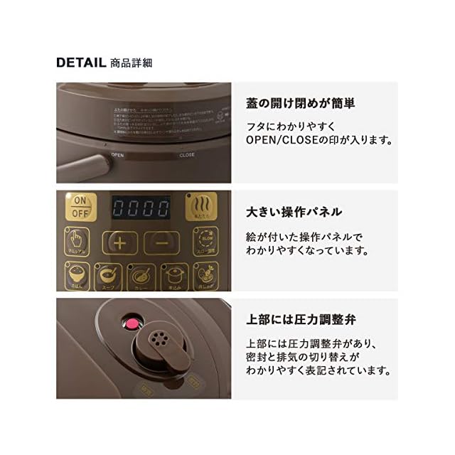 【機能】調理容量:約1.5L/ 呼び容量(満水容量):約2.5L、定格消費電力:700W、使用最高圧力:70kPaゲージ圧、ワンタッチメニューモード(5メニュー)、マニュアルモード、保温機能(最大12時間)、スロー調理モード(最大12時間)、あたためモード