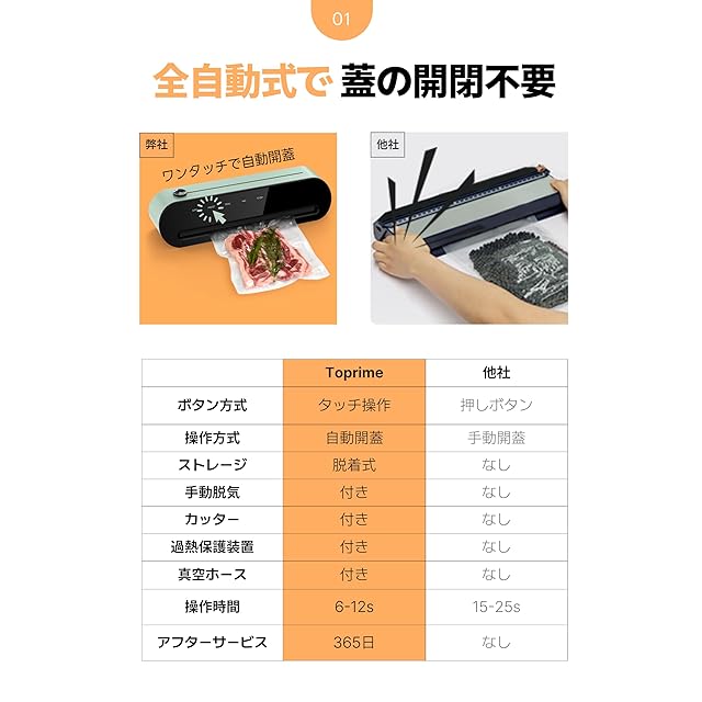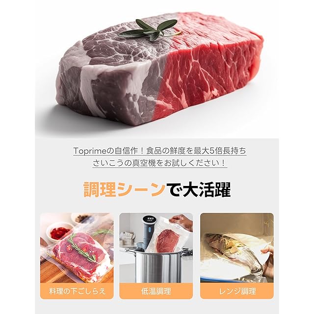 【5in1多機能モード】Toprime真空パック機は、5つのモードを搭載しています:ドライ/モイスト自動真空シールモード、シールのみモード、手動脱気モード、外部吸引モードがあります。-60kpaの強力な吸引力により、数秒で真空パックができ、食品を冷蔵庫で保存できます。
