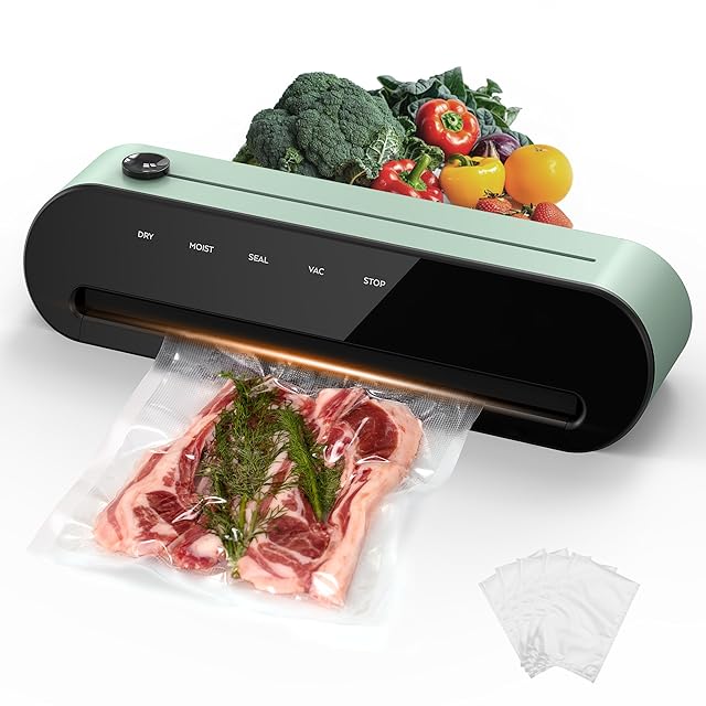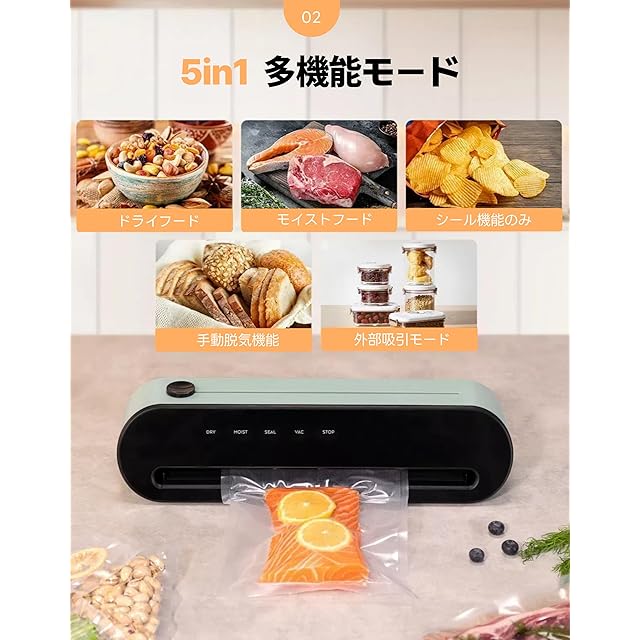 Toprime 真空パック機 フードシーラー ワンタッチ 自動真空シーラー -60Kpa吸引力 5in1 真空パック 真空バッグ付き フードセーバー 家庭用 乾湿対応 ヒートシーラー 操作が簡単 白緑