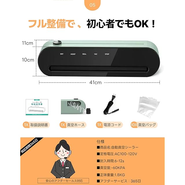 【お得なセット内容】初心者向けのシンプルなキット:真空機×1、真空袋×10、真空ホース×1、電源コード×1、日本語取扱説明書×1、1年間のアフターサービス。商品についてご不明な点がございましたら、お気軽にお問い合わせください。お客様にご満足いただけるよう、丁寧で心のこもったサービスをご提供いたします。