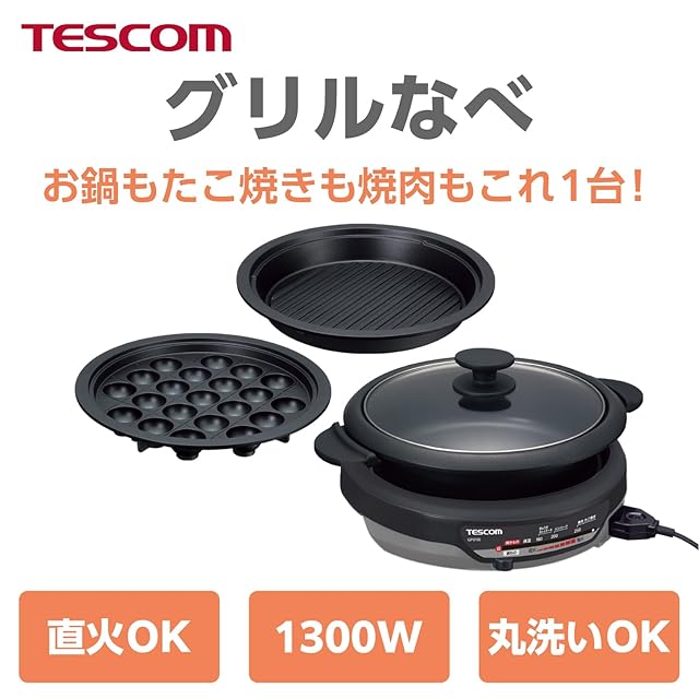 テスコム グリルなべ 3.4L 直火可能 1300W たこ焼きプレート/溝つきプレート付属 【煮る/焼く/蒸す】 フッ素コート GP91 スタイリッシュグレー 正規品 GP9100 H