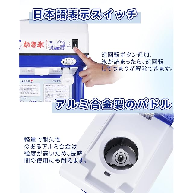 緑の力で、心と体に優しい食生活</br> ▼プロの現場を支える「氷のエキスパート」▼</br> 飲食店・夏祭り・商業厨房向けに開発された業務用かき氷機。</br> ・高速処理:120kg/hの砕氷速度で、行列ができる繁忙期も氷切れなし!</br> ・無段階調整:ダイヤル操作で氷の粗さを滑らかに調整可能。刺身の盛り付けに適したザクザク食感から、デザート向けの綿雪氷まで、幅広いニーズに対応。</br> ・耐久設計:ステンレス刃+アルミ合金パドルは、腐食に強くメンテナンス簡単。</br></br> ▼ こんなシーンで活躍 ▼</br> ・夏祭り屋台:3秒で1杯のかき氷を提供し、客待ち時間を解消!</br> ・飲食店:刺身の盛り付け用粗氷からデザート用細氷まで、一台で完結。</br> ・カフェ:オリジナルかき氷メニューを手軽に開発可能。</br></br> ▼ ユーザーの声 ▼</br> 居酒屋オーナーA様</br> 「従来機より3倍速く、アルミパドルの酸化も説明書通り手入れすれば問題なし!夏の繁忙期に必須です。」</br> 祭り出店業者B様</br> 「多形状氷対応で製氷機との連携が楽に。安全ロックもあり、スタッフ教育の負担が減りました。」