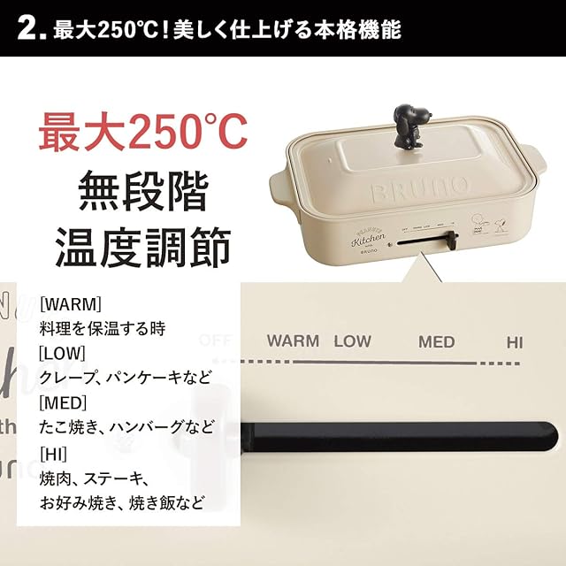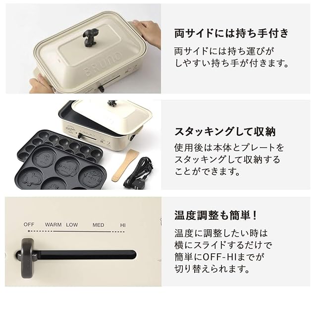 BRUNO ブルーノ コンパクトホットプレート スヌーピー PEANUTS コラボ 本体 プレート3種(たこ焼き 平面 マルチ) スヌーピーノブ 付き ホワイト White 白おしゃれ かわいい これ1台 蓋 ふた付き 温度調節 洗いやすい 1人 2人 3人用 小型 小さいサイズ 少人数 ひとり暮らしにも 幅約40㎝ BOE070-ECRU