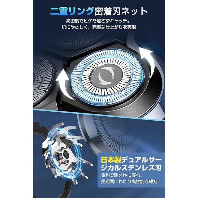 ✅【進化した剃り心地と深剃り性能】日本製デュアルサージカルステンレス刃を搭載した ひげそり 電動シェーバー 、毎分約16,000ストロークの高速リニアモーターでパワフルにヒゲをカット。二重リング密着刃ネットが高密度にヒゲを捉え、肌に優しく、 シェーバー メンズ として最高の深剃り体験を実現。 髭剃りおすすめ ランキング常連の性能で、頑固なヒゲも一発で処理。 電動ひげそり メンズ をお探しの方に最適な 電動髭剃り です。