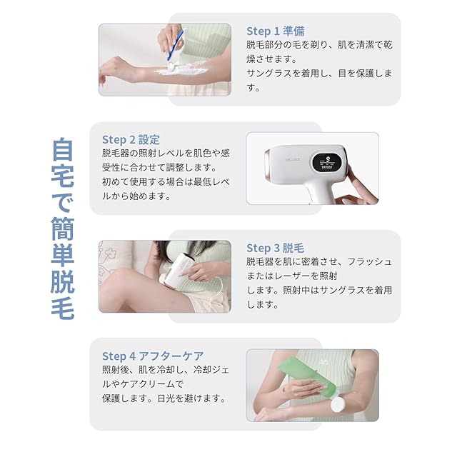 【お肌に優しい9段階のパワー調整】 9段階の出力レベルで、肌質や部位に合わせて自由に調節可能。敏感肌の方でも安心して使用でき、より快適でスムーズな脱毛体験を提供します。低ノイズ設計(60dB以下)により、リラックスした環境で使用できるのもポイントです。