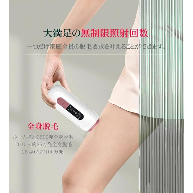 【モードを使い分けて肌にやさしくケア】個人であるいは家族2〜3人で使うのであれば生涯使える無制限照射回数です。5段階照射レベルだけじゃなくて、体の部位に適する4種類(腕/脚・フェイス・脇・ビキニ)の波長域を用意しているため、 幅広い毛質に合わせてより正確かつ迅速に全身脱毛を実現できます。光の作用で肌の毛穴を引き締め、コラーゲンの生成を促進すると同時に肌深くまで水分を長期間ロックし、光沢のあるお肌の質感を保ち、キメ改善効果が期待できます。レーザー光による目のトラブル回避のためサングラスを着用した上での使用がオススメします。
