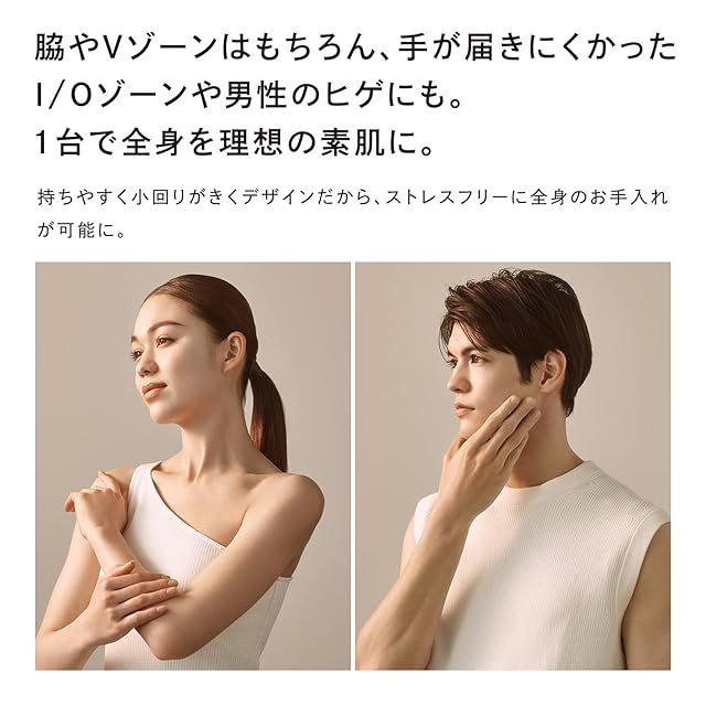 【脇やVゾーンはもちろん、手が届きにくかった I/Oゾーンや男性のヒゲにも。1台で全身を理想の素肌に】持ちやすく小回りがきくデザインだから、ストレスフリーに全身のお手入れが可能に。