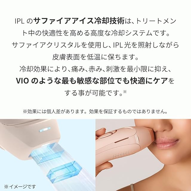 【冷却機能搭載】サファイアアイス冷却技術「アイスモード」搭載。痛くない※脱毛ケア。痛みの感じ方には個人差があり、「痛くない」をするものではありません。