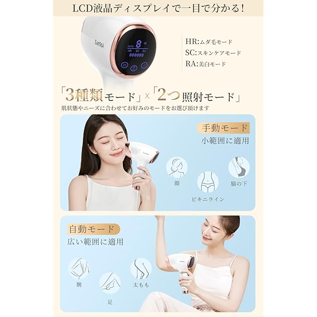 「3in1多機能」本製品には3つのモードが搭載されています。HRモードはムダ毛ケア、SCモードはスキンケア、RAモードは肌を整えるためのモードです。SCとRAモードは週に1〜2回の使用をおすすめしています。同じ部位に1つの機能を1日中使用することができますが、異なる機能を使用する場合は、24時間以上開けてからご使用ください。