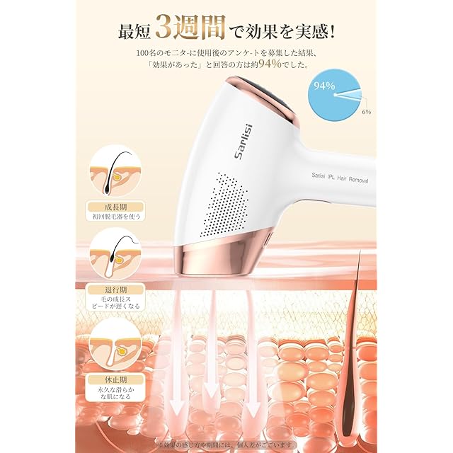 「家庭用IPL光脱毛器で、サロン級の美容体験をご提供します」Sarlisi脱毛器は肌にやさしい先端の美容技術を採用しています。IPL光は毛包を狙い、照射することで温熱効果を与えます。定期的な照射により、ムダ毛の発育を阻害し除毛効果を得ることができます。継続的な使用により、約8週間後にはお肌が滑らかになり、ムダ毛が目立ちにくくなる効果を実感できます。