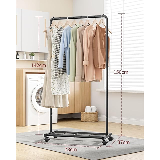便利な移動設計:Sakugi 洋服ラックは、360度回転する4つのキャスターを搭載しており、そのうち2つはロック機能付きで、移動と固定が簡単に行えます。このパイプハンガーは、家庭やオフィスでの使用に最適で、使いやすく柔軟な収納方法を提供します。