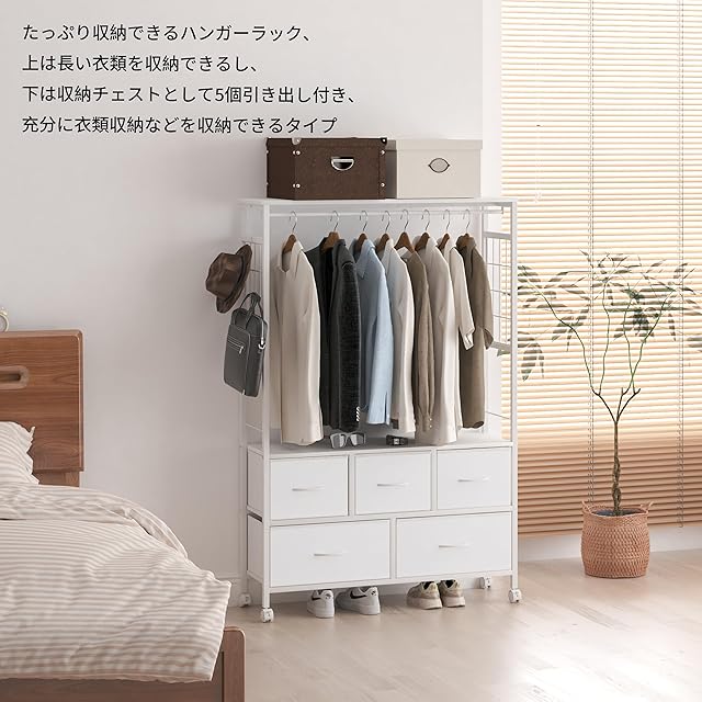 LunarLight ハンガーラック 幅100奥行30高さ151.2cm パイプハンガー ワードローブ クローゼット引き出し 洋服掛け 衣類コンパクトで収納 多機能 収納チェスト 収納ケース 大容量 頑丈 スリム おしゃれ ストッパーキャスター付き(移動式と固定式2機能) 全体耐荷重150kg 組立簡単 耐震転倒防止 大容量収納引き出し2段5杯 (真っ白)