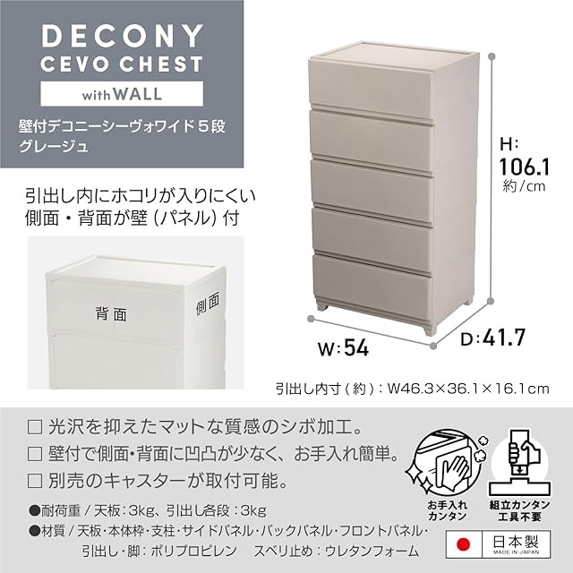 JEJアステージ(JEJ Astage) 収納ケース 壁付デコニー シーヴォ 5段 ワイド グレージュ簡単組立 日本製 幅54×奥行41.7×高さ106.1cm