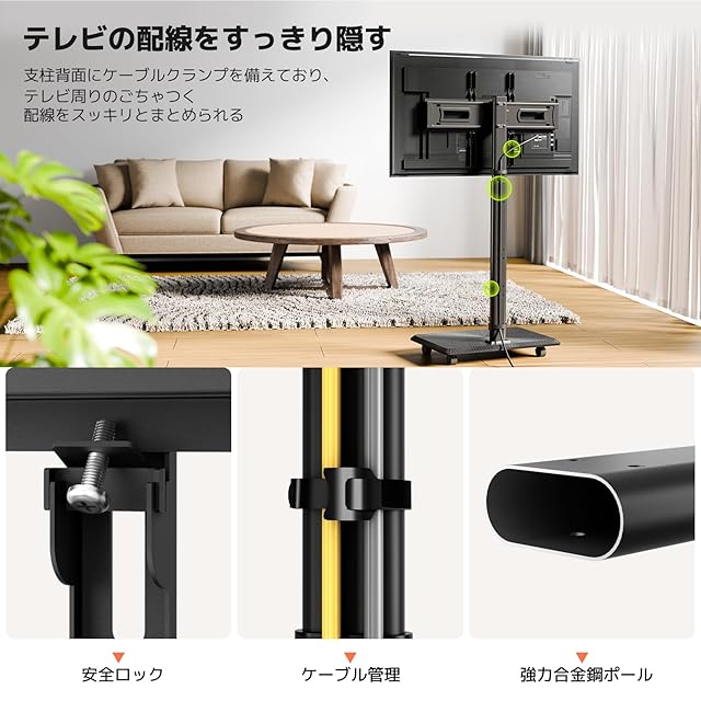 【初心者でも簡単組み立て / 収納棚・ケーブル管理機能】 TC30は、シンプルなデザインで、重たいテレビキャビネットを必要としません。女性でも簡単に組み立てができ、壁に穴を開けることなく賃貸住宅にも設置可能です。また、内蔵のケーブル管理システムにより、電源ケーブルやデータケーブルをすっきりと整理できます。取り外し可能な棚板は、タブレットやパソコン、ゲーム機などの周辺機器を収納するのに便利です。