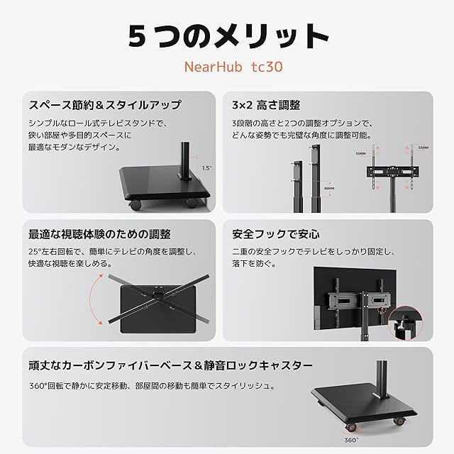 【「高さ・角度調整可能」快適な視聴角度 / 様々なシーンに対応】 TC30は、3段階の高さ調整に対応し、お客様の視聴環境に合わせて簡単に調整可能です。25°左右回転も簡単に調整できるので、どんな位置でも快適にテレビを視聴できます。この柔軟な調整機能により、会議室、教室、オフィス、自宅など、様々なシーンに最適です。