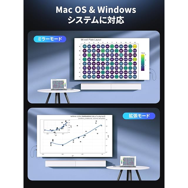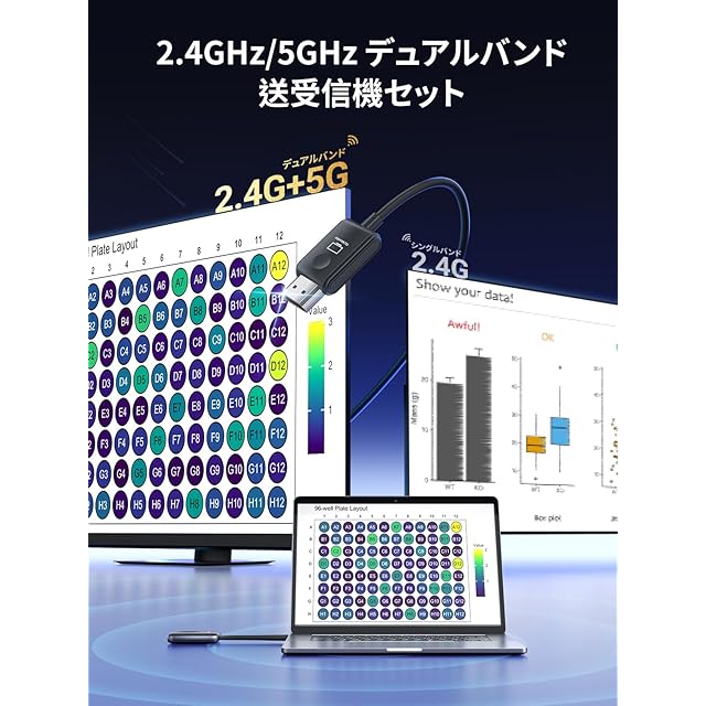 【5G/2.4GHzのデュアルバンド技術&最大50mの無線安定伝送】5G/2.4GHzのデュアルバンド技術を採用し、見通しの良い環境では最大50mまでのワイヤレス伝送が可能です。広い会議室や製品展示会など、広い空間での使用に適しており、煩雑なケーブルの束縛から解放し、デスク周りをより整然とさせます。高品質なチップを内蔵し、信号干渉による遅延を防止します。