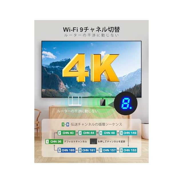 <p>BMOSTE 910 ワイヤレス HDMI トランスミッターおよびレシーバーで、比類のないワイヤレス接続を体験してください。この最先端のデバイスは 4K ハードウェア デコード用に設計されており、4K Ultra HD メディアを 30Hz でワイヤレスでストリーミングして、鮮明な映像を楽しめます。4K コンテンツを送信する場合でも、1080P ビデオを送信する場合でも、BMOSTE 910 は安定した遅延のないエクスペリエンスをします。後者は安定性が向上し、遅延が短縮されます。</p> <p> 5GHz と 2.4GHz の両方の周波数帯域を利用する BMOSTE 910 で、デュアルバンド Wi-Fi のパワーを活用しましょう。 2.4GHz 帯は伝送範囲が広く、5GHz 帯は短距離接続で高速かつ安定した干渉耐性のあるパフォーマンスを提供します。</p> <p> BMOSTE 910 には 9 つの専用伝送チャネルがあり、デバイスの背面ボタンからアクセスできるカスタマイズ可能なチャネル設定により、最大 4 セットの機器を同じ環境で同時に操作できます。</p> <p> BMOSTE 910 の 4K HDMI ループアウト機能は、送信機側にディスプレイを追加するのに最適で、デスクトップ コンピューター、プロジェクター、TV ボックスなど、内蔵スクリーンのないデバイスに最適なソリューションです。</p> <p> 1 TX から 3 RXS の機能により、3 つの受信機を同時に接続して、ビデオ コンテンツを複数の画面に同時に表示できます。</p> <p> BMOSTE 910 は赤外線リモコン拡張もサポートしているため、さまざまな部屋からセットトップ ボックスを柔軟に制御できます。パッケージにはリモコンは含まれておらず、Bluetooth リモコンはサポートされていないことにご注意ください。赤外線機能を最適化するには、センサーが受信デバイスの赤外線ウィンドウに向けられていることを確認してください。</p> <p> BMOSTE 910 は、干渉防止機能が強化されており、強力で安定した信号でシームレスな視聴体験をします。</p> <p> 使いやすさを重視して設計された BMOSTE 910 は、プラグアンドプレイの利便性を提供し、複雑なペアリング プロセスが不要です。ストア内のすべてのレシーバーと互換性があり、多用途で柔軟なユーザー エクスペリエンスを実現します。</p> <p> BMOSTE 910 は、HDMI 出力を備えたさまざまなデバイスと互換性があります。購入する前に、デバイスが HDMI 出力をサポートしていることを確認し、シームレスな統合と最適なパフォーマンスを確保してください。</p> <p> BMOSTE 910 で、お気に入りのオンライン アプリをすべてシームレスにストリーミングします</p>