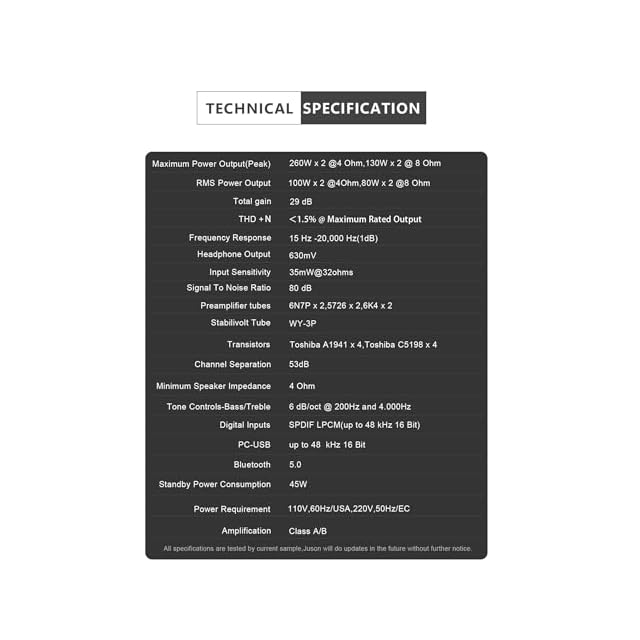 強力な出力:印象的な200W RMS出力により、Juson Audioチューブアンプは活力と魅力的な聴覚体験を提供し、温かみと美しい音のニーズに対応します。