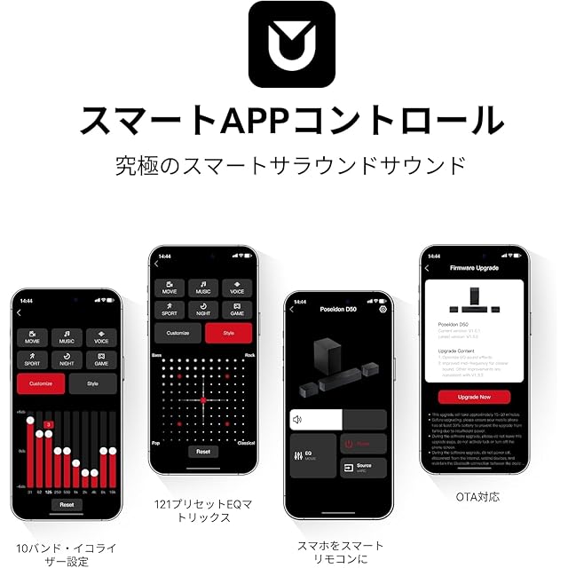ULTIMEA サウンドバー 5.1ch スピーカー サラウンド 320W 大出力 APP制御 ホームシアター ワイヤレスサブウーファー/サラウンドスピーカー付き Bluetooth5.3 夜間モード HDMI(ARC)/Optical対応 日本語説明書付 ブラック Poseidon D50