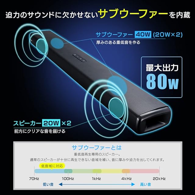 最大出力:20W×2+40W ●形式:密閉型 ●再生周波数帯域:70Hz~20kHz