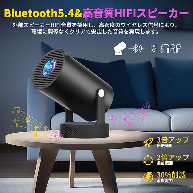 【超高速Wi-Fi 6・Bluetooth5.4・高音質HiFi外部スピーカー】ぷろじえくたー 家庭用 小型 は、独自開発の高精度チップ技術を採用し、2.4G+5Gの周波数帯を同時利用でき、安定した信号と高い伝送速度を備えた超高速6G WiFi接続テクノロジーも備えています。ぷろじえくたー は遅延を最大60%削減されて、映像ストリーミングが途切れることなく、スムーズな視聴体験を提供します。スポーツのライブ中継をリアルタイムで楽しんだり、ゲームプレイ中に遅延を気にせず没入したり、どんな場面でも安定したパフォーマンスを発揮します。プロジェクター のBluetooth 5.4 と高品質 HiFi 外部スピーカーが、厳選された音響環境で迫力ある映像と映画のような雰囲気をお楽しみいただけます。お気に入りのBluetoothスピーカーやヘッドホンと簡単に接続可能、自宅で迫力の3Dサウンドを楽しむことができ、臨場感あふれる映画館のような空間を演出します。