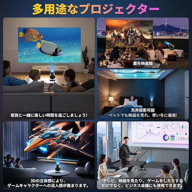 【最新Android TV 12搭載・天井投影・270°回転】プロジェクター にはAndroid TVが内蔵されており、Wi-Fiに接続すると、Prime Video、YouTube、Netflix 、Disneyなどの8,000 以上のアプリから 500,000 本以上の映画やテレビ エピソードを楽しめます。要件に応じて Google PlayストアやApp Store から豊富なアプリをダウンロードできて、TVスティックを別途購入や複雑な設定は一切不要です。プロジェクター 家庭用 は270°自由に回転できる一体型デザインを採用しており、三脚を使用せずに自由に投影角度を選択で、設置場所や角度にとらわれません。小型 プロジェクター は壁や天井に投影でき、座っていても、寝転んでも、横になっても、楽な視聴体験を楽しめます。生活のあらゆる場面で自由に活用できます。
