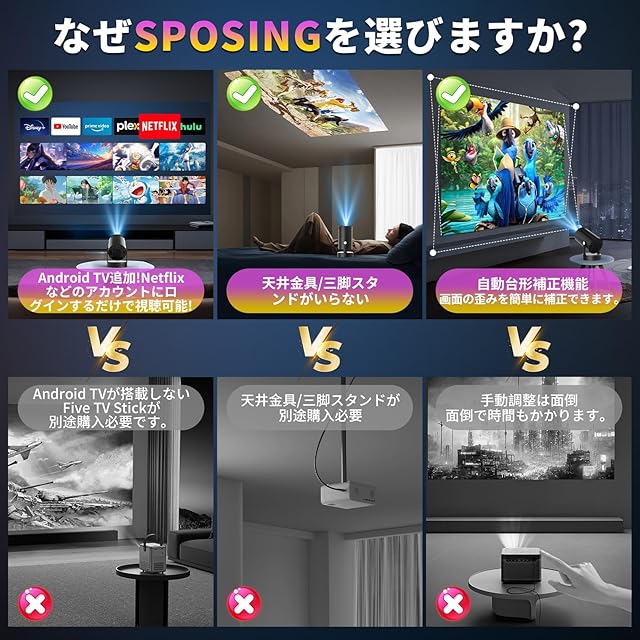 【多彩な互換性・超長い寿命・省エネ】SPOSINGの プロジェクター は無線でも有線でも接続する家庭用プロジェクターはWi-FiとBluetooth接続に加えて、HDMI、USB、3.5mmオーディオポートも搭載しており、PC、DVDプレーヤー、タブレット、USBストレージ、PSゲーム機、スピーカー、ヘッドフォンなど、さまざまなデバイスと互換性があります。超小型プロジェクター は革新的な冷却ファンが採用されて、排気口も設置し、放熱効果が良くて「80,000時間」以上の超長寿命を実現しております。「パッケージ内容」プロジェクター本体、リモコン(単4形乾電池×2本 ※別売り)、電源コード、日本語説明書。