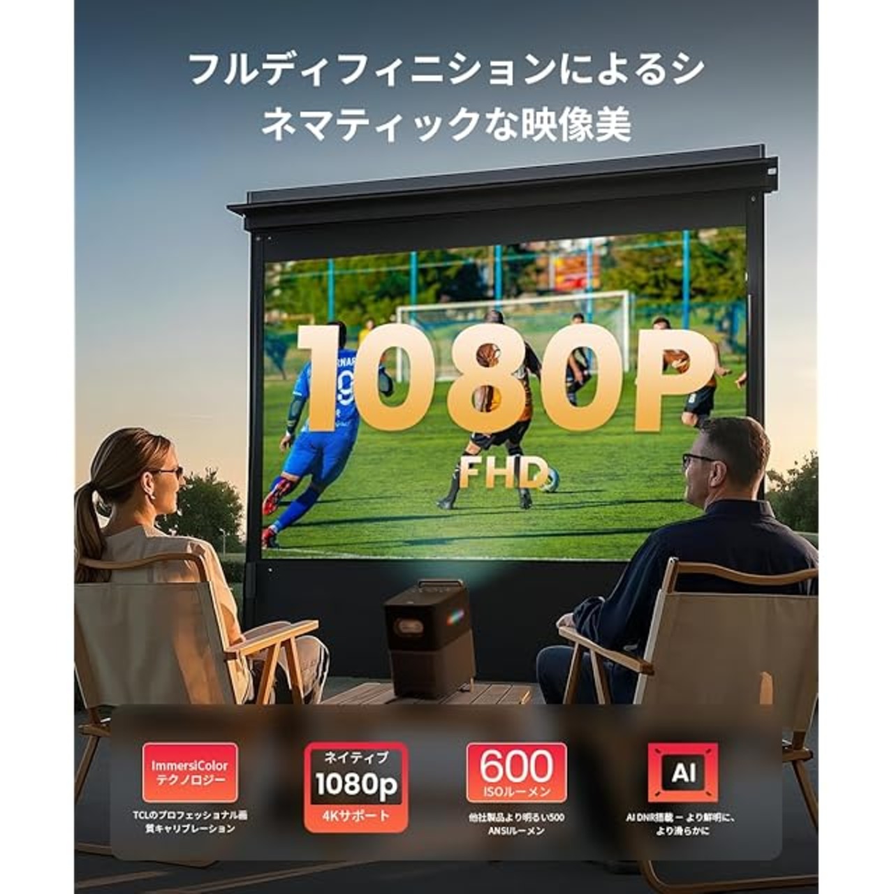"プレミアム品質のディスプレイ:TCL独自のTrueHueテクノロジー、ネイティブ1080PフルHD、600 ISOルーメンの高輝度により、圧倒的な映像美を実現します。4種類のプリセット映像モードと45~150インチまでの投影サイズに対応し、あらゆる空間に最適。臨場感あふれる視聴体験を提供するため、精緻に設計されています。"