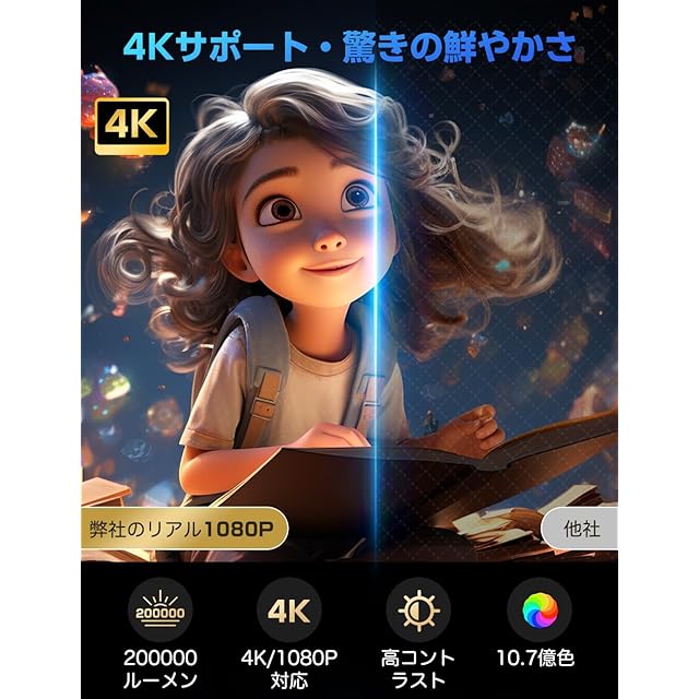 【高輝度・真1080P・4K対応・劇場級画質】この家庭用プロジェクターは20000ルーメンの高輝度と12000:1の高コントラスト比を実現し、NTSC色域95%以上をカバー。スクリーン不要の壁面投影でも原画に忠実な色彩を再現し、4Kソースの滑らかな再生が可能。明るいリビングでも鮮明な映像を提供し、HDR処理により逆光環境でもディテールをくっきり描写。拡散光とアンチブルーライト技術で目に優しく、家族全員が安心して映画やスポーツを楽しめます。