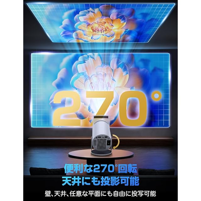 【270°回転スタンド・自動台形補正・設置自由】このホームプロジェクターは一体型270°回転スタンドを装備し、三脚不要で壁・天井への投影が可能。自動台形補正機能が45度以内の傾斜を瞬時に補正し、斜め設置時もリモコン操作で4面補正を数秒で完了。寝室で寝転びながらの映画鑑賞やキッチンでのレシピ確認など、生活シーンに合わせた自由な投影角度を実現します。