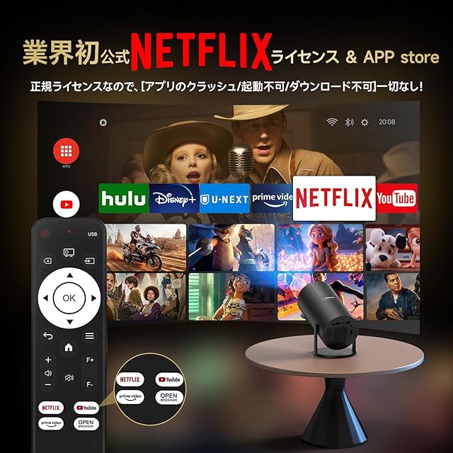 【2025年8月本格発売! 業界初公式Netflix認証済】JOWLURK円筒プロジェクターA20はお客様のご意見を集めて、Netflix公式ライセンスを取得、市販初の公式Netflixライセンスの円筒プロジェクターになりました!従来のAndroid海賊版システムより、複雑なバージョン要件がないため、クラッシュ、起動不可、Netflixサインイン不可などの問題が一切なし!いつか問題が出る心配がせず、内蔵したYoutube・Disney+・Prime video・huluと一緒、Fire TV stickがなくても映画館ように滑らかな大画面を自宅で簡単に楽しめます!更に、スマホの小画面で止まっていたのを補い、My appのウェブページでtiktokなどのほかのアプリのショートムービーを大きな画面で体験できます!【限定期間キャンペーン】今ご注文いただくと、すぐ「100インチスクリーン」がもらえる!お気軽に説明書の連絡先より弊社までご応募してください!