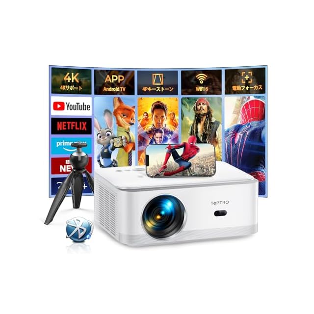 【Android TV&電動フォーカス&自動台形補正】- プロジェクター 小型 高輝度700ANSI リアル1080P&4K対応 プロジェクター(三脚スタンド付き) WIFI6 Bluetooth5.3 50%ズーム機能 内蔵10W*2スピーカー 防塵·静音 IOS/Android/DVD/パソコン/PS4/USB/HDMI/SWITCHなど対応 プロジェクター家庭用 Toptro X6