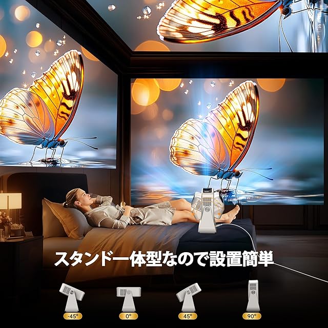 【自宅の壁や天井がシアターに】スタンド一体型設計のため、投影角度を自由に調整可能。天井や壁など自宅の好きな場所でお気に入りの映画やゲーム、音楽など様々なコンテンツを最大300インチの大画面でお楽しみいただけます。