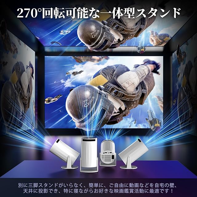 【270°回転&自動台形補正&電動フォーカス】据え置く型プロジェクターと異なり、このプロジェクターは270°回転できる一体型スタンドが装備されているため、三脚を使用する必要がなく、スタンドを回転するだけで、自由に投影角度を選択して、壁や天井などに投影でき、座ったり、寝転んだり、横向きになったりしながら、リラックスした映画鑑賞体験を実現できます。また、この天井プロジェクターは自動的に上下を調整する自動台形補正機能を搭載しており、4面補正と合わせて、リモコンでどの角度から見ても最適な投写映像に調整します。あなたのスタイルで、映像体験をお楽しみください!(ご注意:リモコンを本体の後ろに向いて操作してください。一部のアプリケーション画面ではリモコンのカーソルを切り替える必要があります。)