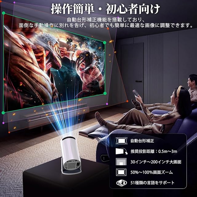 【Android TV搭載&大画面】ホームプロジェクターにはAndroid TVが内蔵されており、Wi-Fiに接続すると、インストールされたアプリを通じてお気に入りの映画やテレビ番組を視聴できます。 Android TV プロジェクターで 8,000 以上のアプリから 500,000 本以上の映画やテレビ エピソードを楽しんだり、Prime Video、YouTube、Netflix などの幅広い映画やビデオを30インチから200インチまでの大画面でお楽しみください。さらに、要件に応じて Google Play ストアから豊富なアプリをダウンロードできます。 Wi-Fiでスマートフォンやタブレットと接続し、ご家族やお友達と一緒に豊富なコンテンツをお楽しみいただけます。※鮮明な画像を確保するために、本体の上にあるフォーカス調整リングを回転して投影距離と画面の大きさを調整してください。