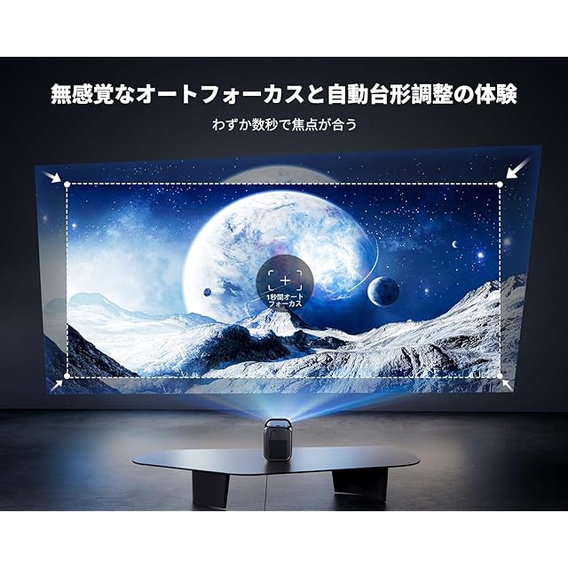 【オートフォーカス & 自動台形補正】- プロジェクターに内蔵されたセンサーにより、自動台形補正やオートフォーカスなどのインテリジェントな機能を実現し。1秒で自動的にクリアで正しい画像をキャプチャすることができ、時間のかかる投影操作を心配することなく。視聴中のコンテンツを中断することなく調整を実行します、プロジェクターの任意の配置を行うことができます。