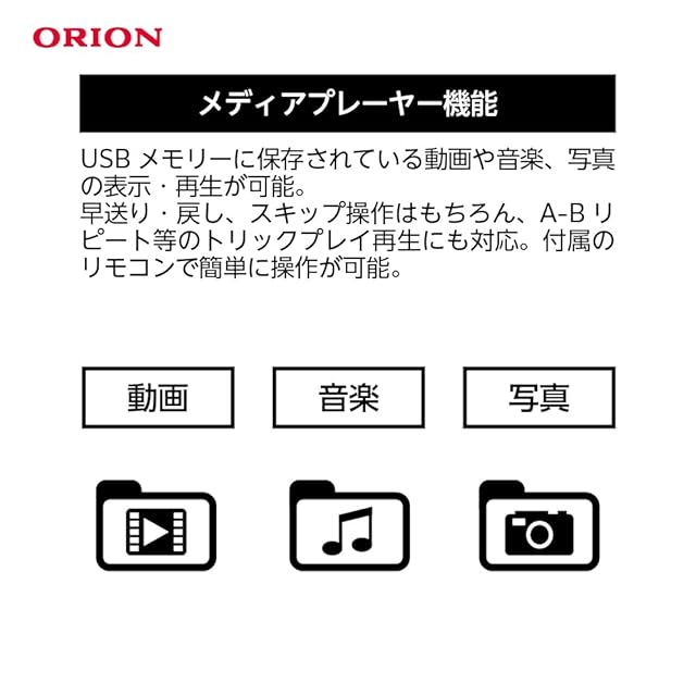 メディアプレーヤー機能。USBメモリーに保存されている動画や音楽、写真の表示・再生が可能。早送り・戻し、スキップ操作はもちろん、A-Bリピート等のトリックプレイ再生にも対応。付属のリモコンで簡単に操作が可能。