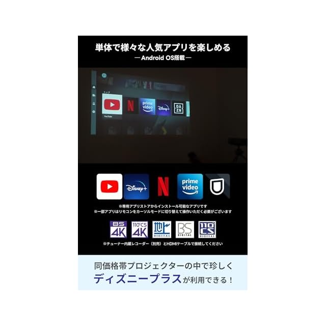 【人気の動画アプリを利用できる】YouTube/Disney+/Netflix/ビデオ/U-NEXTなど、人気の動画アプリをインストールして利用できます。特に同価格帯のプロジェクターの中で珍しくDisney+を単体で利用することができます!